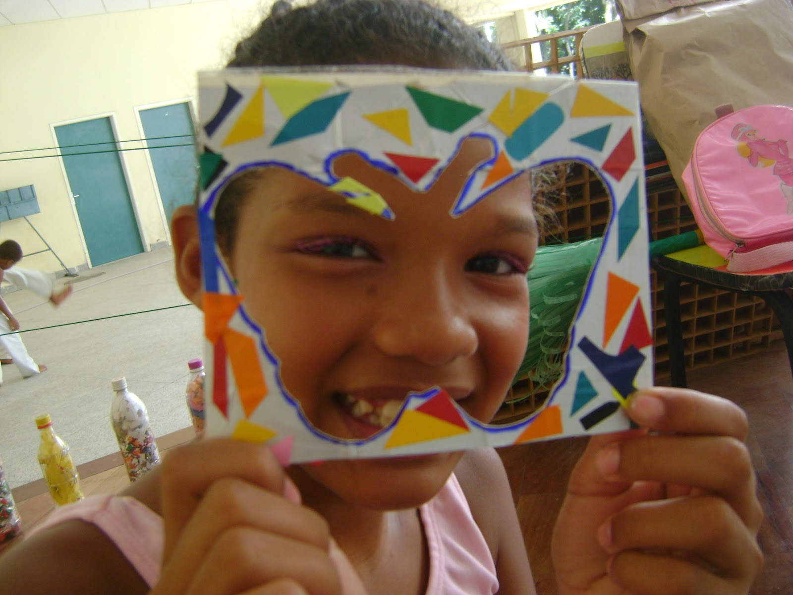 As atividades dessas crianças foram feitas com embalgem tetra-pak(leite longavida) e adesivos coloridos.